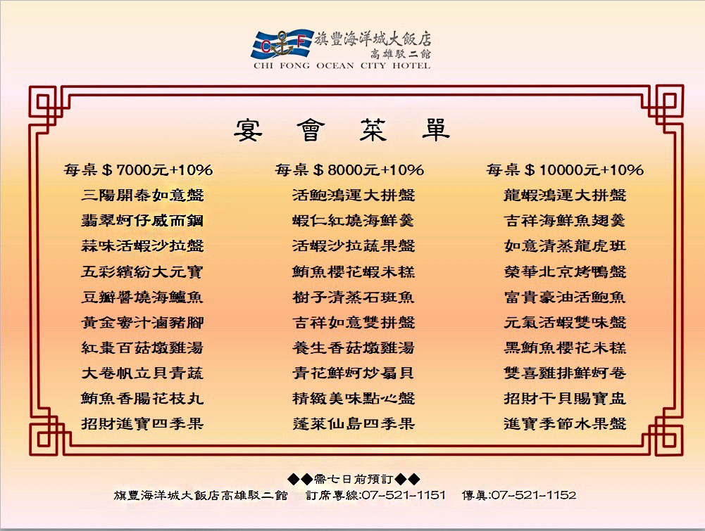 旗豐海洋城大飯店 高雄駁二館 宴會菜單
